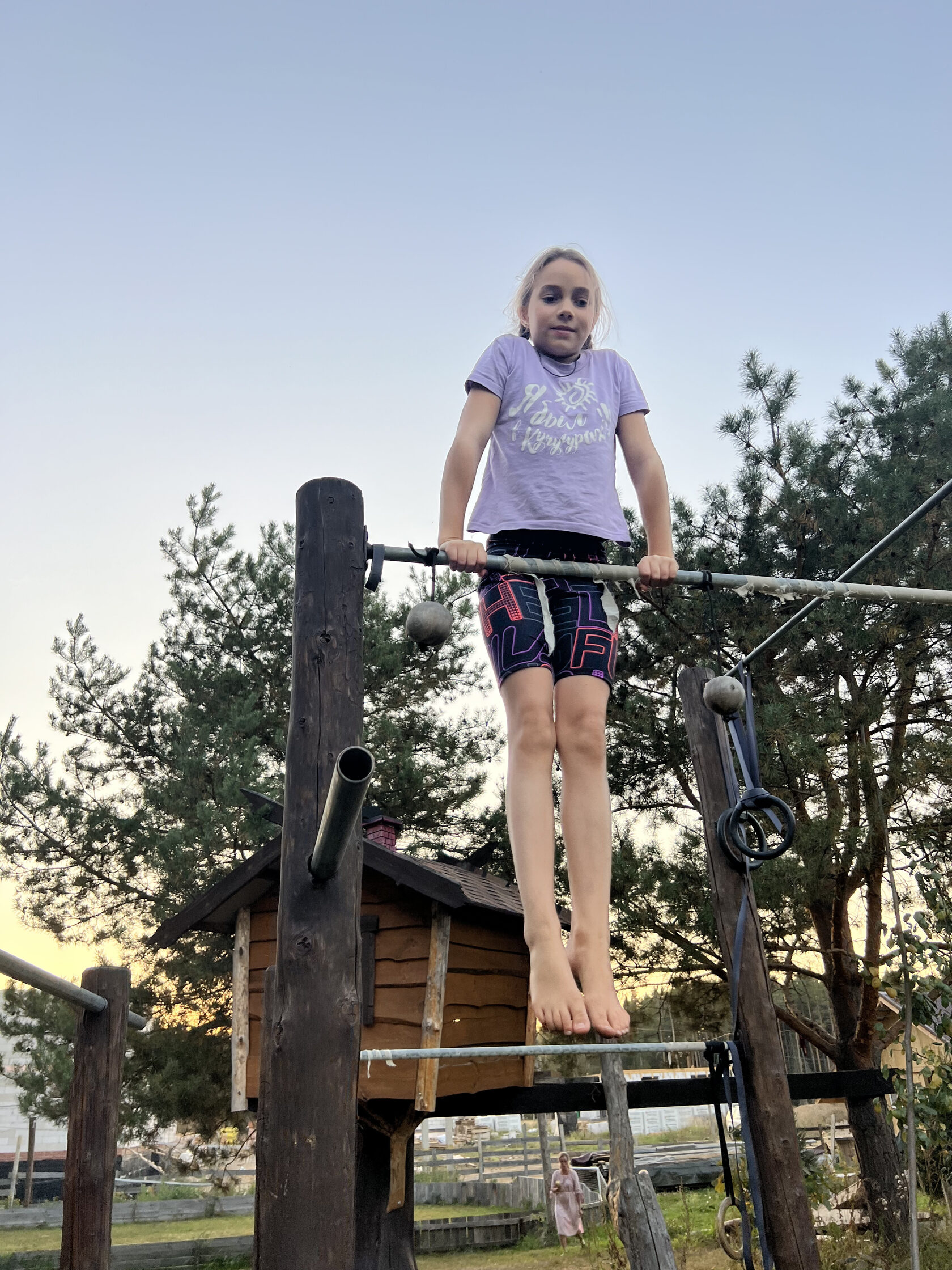 К сожалению, турник входит не в каждый спортивный комплекс, в основном из экономии места. Поскольку наш папа на пространстве для спортивных снарядов не экономил, у нас дома было даже два турника. Один — повыше и потолще, на котором мог заниматься и взрослый, второй — пониже и более тонкий. Турники располагались под прямым углом друг к другу. Такое расположение сразу резко увеличивает возможности их применения, особенно в сочетании с шестом, на котором они крепятся.